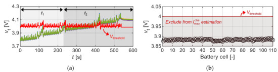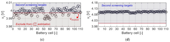 Figure 7a shows the calculation results of Vthreshold based on the experimental results in Figure 4. The screening results through Vthreshold can be divided into two sections. During t1, all the cells are excluded, as shown in Figure 7b, because all the cells satisfy the condition in Equation (8). Therefore, of the battery pack was determined as without the second screening process. In contrast, the voltage of some or all cells started to exceed Vthreshold during t2, as shown in Figure 7c,d. Therefore, these cells were screened through the second screening process, as described in the following sections.