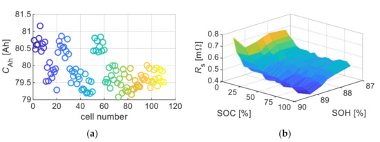 This battery pack was used as the main energy source for EVs until the SOH reached 89% (the end of life was 80%). OCV and ∂OCV/∂SOC are shown in Figure 3a,b, and the identification results of CAh and Rs are presented in Figure 9a,b. CAh was measured through a fully charging and discharging experiment at 0.3 C, and OCV and Rs were extracted by repeating a discharge at 0.3 C to reduce the SOC by 5% and relaxation for 4 h to reach equilibrium [24]. CAh and Rs have inconsistencies that make and of every cell different from each other.