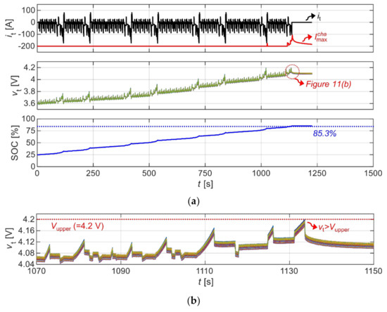 The feasibility of the proposed algorithm was verified based on , and the battery pack was charged from an initial SOC of 25% by repeatedly applying the NEDC profiles at room temperature (25 °C). The experiment was stopped if the battery pack was charged to an SOC of 95% or if the voltage of one of the 110 cells reached Vupper (4.2 V). To further verify the proposed algorithms, an experiment for a counterpart that used the average values of CAh, Rs, and vt without considering the cell inconsistencies was performed, as shown in Figure 11a. The experiment was stopped when the battery pack was charged to an SOC of 85.3%, because one of the vt in the battery cells reached Vupper, as shown in Figure 11b.