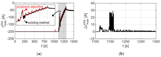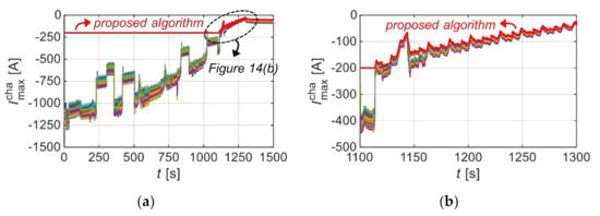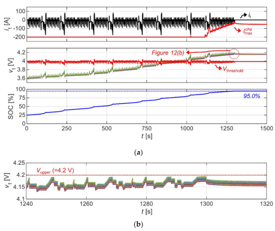 In contrast, as shown in Figure 12a,b, the proposed algorithm can manage all the cells such that they are charged in the allowable voltage range, and the battery pack was charged to an SOC of 95%. For the first screening, Vthreshold was calculated in real time and the calculation results are plotted in Figure 12a using a red line. As shown in Figure 13a, the first screening excluded all the cells from 0–537.8 s, because Vthreshold was larger than vt of all the cells. Therefore, of the battery pack was determined to be (−200 A) without the second screening. After 537.8 s, some or all cells had vt greater than Vthreshold, and the second screening was performed on these cells. Consequently, the proposed algorithm selected a few cells, as shown in Figure 13b, where the maximum and average numbers of cells were 10 and 2.18 cells, respectively.