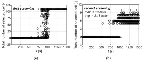 The cell number selected by the screening algorithm in the time interval of 1100.0–1300.0 s: (a) based on the existing method in [21] and (b) based on the proposed algorithm.
