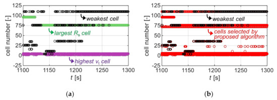 The screening performance of the proposed algorithm was compared to the existing method in [21], which selects two cells with the largest Rs and the highest vt (or the lowest vt for ). As shown in Figure 15a, the existing method cannot ensure to include the weakest cell in the screening results. The main reason for this problem is that is affected by Rs, vt, and CAh, simultaneously, but the existing method simply considers only Rs and vt separately. In contrast, the proposed algorithm always includes the weakest cell, as shown in Figure 15b, and it is significantly superior to manage all the cells within the allowable voltage range.