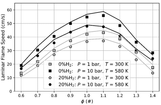 Comparison between laminar flame speed from premixed flame experimental data (markers) and chemical kinetics simulations (solid lines) for pure methane and a methane–hydrogen blend. The effect of the fuel–air normalized ratio is shown for two environmental pressure-temperature conditions.