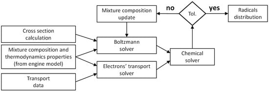 For the sake of clarity, the complete workflow of the Corona ignition model is schematically represented in Figure 3 with the flow-chart of the algorithm. The code relies on three steps: (i) feeding with swarm transport thermodynamic and electric conditions the electron transport equation for electrons, positive ions and negative ions, coupled with the charge conservation equation; (ii) the Boltzmann equation, which computes the EEDF (Electron Energy Distribution Function) and collision rates based on cross sections data and operative conditions; and (iii) the extended chemical kernel. The whole process exits from the loop when convergence occurs. Convergence is assumed to be reached when the composition update absolute error is less than the absolute tolerance of 1 × 10−6.