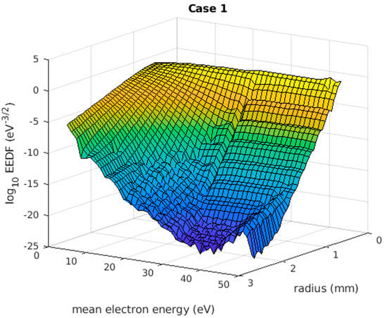 Once the Boltzmann solver has returned the EEDF, the reaction rate of the j-th species interacting with electrons according to the i-th mechanism (excitation, dissociation, attachment, or ionization) was defined as in Equation (10). For the sake of illustration, the EEDF returned by the Boltzmann solver based on the temperature-density-composition data provided by the engine thermodynamics model is shown in Figure 4 for the case one (reference, pure methane). It is visible that at the HFI tip (radius equal to zero) there is an almost equiprobable distribution of the energies in the visible spectra that electrons may have. Then, the longer is the distance from the tip, the more the electrons’ energy is distributed over the lower values (5–20 eV) due to the electric filed magnitude derating. Those results are in line with the evidence shown in [29]. The Boltzmann solver validation has already been performed in the previous work [21], with comparison between the implemented in-house solver and two different open software options. The procedure also compared total ionization and attachment collision rates showing good matching of the results.