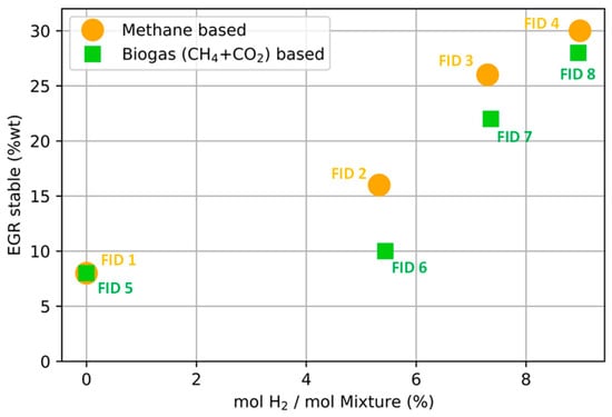 Comparison of the increasing EGR stable allowed by increasing the fraction of hydrogen in methane (orange marker) and biogas (green marker). Each marker reports a progressive number as a Fuel Identification number (FID).