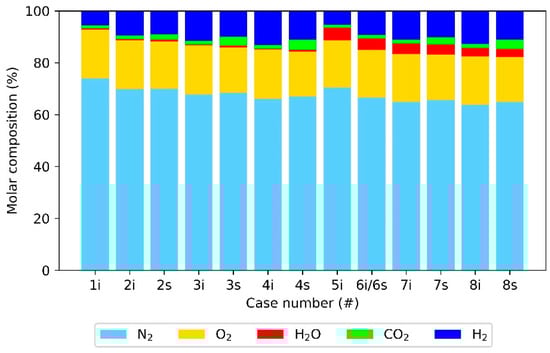 As a result, a simulation matrix of 13 points was created comprising: (i) only the iE (internal residual EGR) dilution for pure methane and biogas CH4 40% + CO2 60% (cases 1i, 5i, respectively); (ii) both iE and sE (stable limiting EGR value) for the methane-hydrogen blends (cases 2i–2s, 3i–3s, 4i–4s) and for the two biogas options with the higher hydrogen content (7i–7s, 8i–8s); (iii) the internal EGR and the stable EGR conditions for the low-hydrogen biogas (FID 6) were considered as equal (EGR 10%wt) due to the slight differences between the chosen minimum EGR (iE) and the predicted stable EGR. The mixture composition of the 13 simulation cases is resumed in Figure 6 in which, as mentioned before, methane is not shown because its molar fraction is stack in the hydrogen composition. Besides the mixture compositions shown in Figure 6, the Corona discharge code must be provided with the gas temperature and density at the ignition time. The latter values were determined by means of the engine thermodynamics model (Equations (1) and (2)) resulting in gas temperature around 600 K and gas density around 6 kg/m3 for the internal EGR cases (iX), whilst values around 580 K and 7 kg/m3 were found for the stable EGR cases due to the external EGR cooling effect and the increased gas pressure given by the larger trapped mass, respectively.