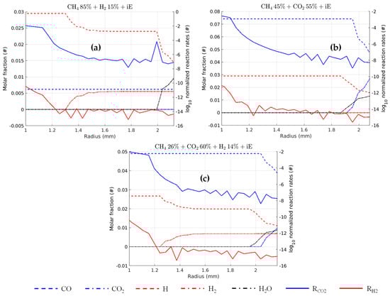 Radial penetration of H, CO radicals and H2, CO2, H2O molecules at the ignition time (left y-axis, dashed lines). The reaction rates of H2, CO2 are also shown on the right y-axis (solid lines). Plot shown for three different fuel blends (methane–hydrogen 15% (a); biogas (b); biogas–hydrogen 14% (c)).