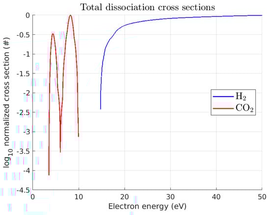Log10 normalized total dissociation cross section for CO2 and H2.
