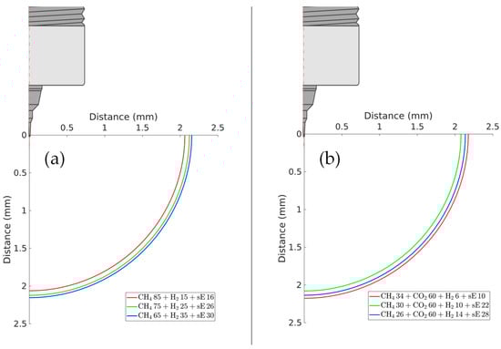 The aim of this chapter is the comparison between the different fuel blends ignited at the predicted EGR stable limiting values in terms of discharge radius formed around the Corona tip. It must be underlined that the discharge radius is identified as the distance at which the magnitude of the reduced electric field (electric field/number density of neutrals) is lower than 7.5 Td. The latter was chosen since the simulation results have shown that at such magnitude the energetic content is quite low, indeed, electrons number density around 1 × 106 cm−3 were recorded, which are in line with those typical in atmospheric air. Figure 9a,b show the numerical discharge sphere at the ignition timing for the test fuels (methane + hydrogen in Figure 9b, biogas with hydrogen in Figure 9a, respectively) in which hydrogen is included and the mixtures are diluted up to their predicted stable limiting EGR (sE) values. In both Figure 9a or Figure 9b respectively, slight differences can be noticed in the extension of the high energy volume comparing the stable lean EGR-richer ignition conditions. From Figure 9a,b one can deduce that the discharge radius depends on the ratio EGR/H2, which is around 1.6 (red line), 2.0 (blue line), 2.2 (green line) considering biogas (Figure 9a), and around 0.85 (blue line), 1.04 (green line), 1.07 (red line) considering methane (Figure 9b). Therefore, as discussed, the discharge effect loses performance as more diluted is the fuel (hydrogen in this case) in inert gases. For given fuel–air ratio , the higher is the EGR/H2, the larger is the amount of inert gases available to grab free electrons, which would contribute to the hydrogen dissociation. As a consequence, the reduction of the electrons’ population mean energy reduction is promoted, thus, the cross-sections in Figure 8 are pushed towards values on the lower branch of the hydrogen dissociation.