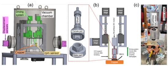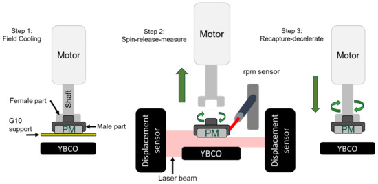 Figure 3 shows the planned experiment steps. First, the PM was placed on the G10 support and was coupled to the shaft. The male and female parts of the PM coupling slip and mate because of their chamfer structures. Then, both vertical linear stages moved the G10 support and the driving system towards the YBCO bulk at a common velocity to the desired cooling height. Next, the YBCO bulk was cooled into the superconducting state with the PM in its vicinity (field-cooled (FC) condition). The support was moved down and then aside. Next, the speed of the motor was gradually increased to the target speed. After a few seconds, the motor and the shaft were moved upward, releasing the PM to be freely levitated and rotating above the superconductor.