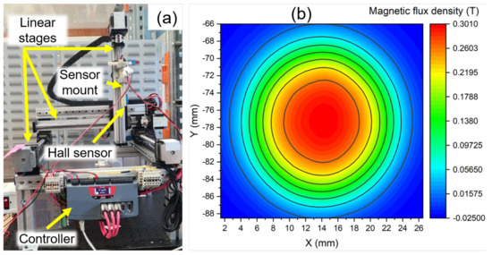 To characterize the field from the PM we designed and built a benchtop setup (Figure 2) to map the magnetic field in a 3D volume. The magnetic field was measured by a Hall sensor supplied by [39]. The sensor was mounted on the tip of a cylinder made of G10. The 3D motion with a resolution of mm was realized by linear stages controlled by an controller supplied by [40].