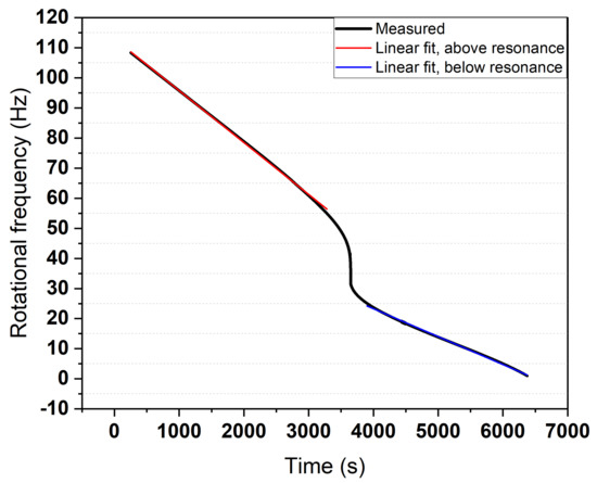 where k is geometric factor of order of unity, is magnetic field inhomogeneity, is the permeability of free space, and A/m is the critical current density of the YBCO puck, estimated from force-decay experiments [42]. From Equation (1), mW of power is dissipated due to magnetic field inhomogeneity. Figure 4 shows the deceleration of the PM (17 mm) during a spin-down test from 6600 rpm operated at 35 K. A resonance behaviour can be seen at 45 Hz. A deceleration rate of Hz/s (above resonance) and Hz/s (below resonance) was calculated by fitting a straight line to the data. The coefficient of friction is given by [10]: