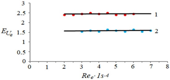 Dependence of the Euler’s number of an operating path of the vortex heat generator on the path load: (1) heat generator with the installed vortex accelerator of the liquid flow and (2) heat generator without the vortex accelerator of liquid flow.