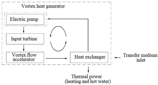 A vortex heat generator, transforming the vortex motion into the thermal energy using cavitation [], with an analysis of the multi-component gas mixture transport through the porous structure [], is an energy-saving and environmentally-friendly device []. The application of a vortex accelerator with certain geometry as a flow energizer constitutes the vortex heat generator specificity [,]. The high degree of a transfer medium flow swirl supports the vortex flow development within a working channel of the vortex heat generator due to the accelerated velocity and the decreased output pressure []. The above-mentioned controls the low ratios of hydrodynamic resistance of the working channel, thus favoring the initiation of the cavitation processes.