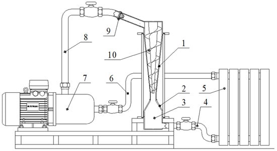 Structural design of the vortex heat generator: (1) main body (confuser); (2) diffusor; (3) cushion chamber; (4) export pipeline; (5) heat exchanger; (6) return pipeline; (7) pump; (8) supply pipeline; (9) turbulizing nozzle; (10) vortex flow accelerator.