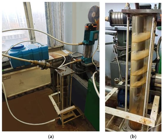 The designed and manufactured vortex heat generator was built in an experimental stand equipped with thermal monitoring tools to test its hydrodynamic indices. Figure 6 shows a general view of the experimental stand (a) and the movement of uncompressed gas (heat carrier) along the working space of the vortex generator, which precedes the cavitation mode (b). During the experiment, temperature and pressure were measured with a radial thermomanometer MT-80-TM (6 bar, 120 °C). For the measurements of the coolant temperature inside the device, a thermal imager brand Flir C2 was employed. Power and energy consumption were measured by meters brand NIK 2303L AR3 (T) 1000.MS.11, mounted in the panel KVPA.