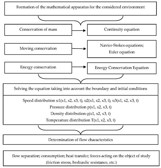 The system of linear differential equations in the software block consists of: equations of motion (Navier−Stokes equations or Reynolds-averaged Navier−Stokes equations for cases describing turbulent flows), continuity equations, energy conservation equations, equations of state, and initial and boundary conditions. Figure 8 shows an analytical model for the mathematical modelling of the hydrodynamic motion inside the working space of the device [].