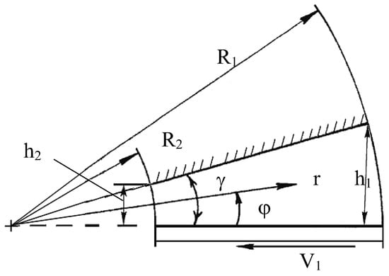 In Figure 8, means the medium line. In this context, index 1 corresponds to the medium channel inlet and index 2 is its outlet. In this case, the motion will be performed towards the negative direction, as for the radial axis; hence, the velocity value should be negative as well. Considering the assumption that secondary flows are not available within the working gap, the axial velocity component and the angular one can be set to zero. If only the radial velocity component is taken into consideration, then: