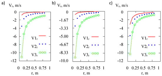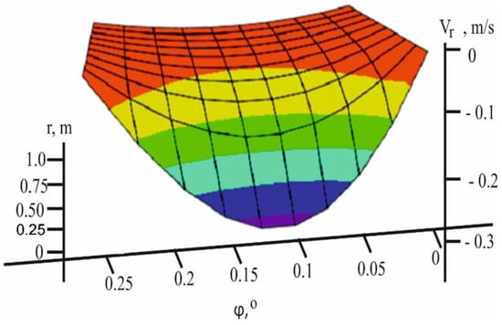 The operation of the vortex heat generator was analyzed using a mathematical modelling method on the developed mathematical model. The following initial parameters of the initial data for the calculations were specified as follows: m3/s; ; mm; mm; and mm. For these values, the inlet and outlet channel widths are = 0.207 m and = 0.018 m, respectively. The surface of the radial component values (11) has been derived for variability ranges such as and . Figure 9 shows the results of the calculations.