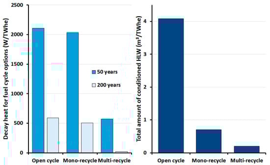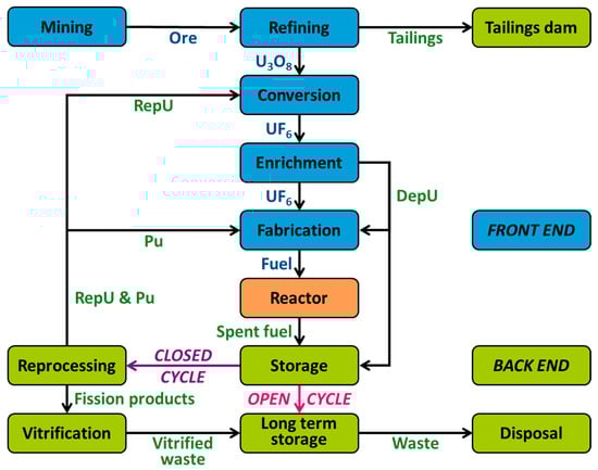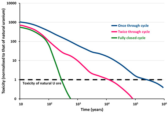 It is clear that nuclear energy can make a major contribution to global low-carbon energy needs and, for example, in the United Kingdom, this is reflected in the recent Energy White Paper, which includes a role for nuclear in meeting the UK’s target of “Net Zero” carbon emissions by 2050 [1]. Realising the ambitions of decarbonising heating and vehicle fleets will prove challenging and require considerable effort, which will likely not be limited solely to electrification. Until now, nuclear energy has been deployed almost exclusively in generating low-carbon (typically baseload) electricity, but the potential for high-temperature nuclear systems to contribute beyond electricity generation in the form of hydrogen production or direct heating should be appreciated. However, whilst much focus is placed on the types of nuclear reactors that will be required to meet future requirements, the radioactive wastes and particularly the spent nuclear fuels (SNFs), sometimes referred to as used nuclear fuel (UNF), arising from current and future use of nuclear energy will need to be managed. Of course, the full nuclear system, including the management of SNF, must be competitive with other forms of low-carbon energy on economic as well as environmental grounds. Spent fuel is managed either through the storage and disposal of SNF in a waste repository (the “open” or “once-through” cycle), or by reprocessing and recycling the uranium (U) and plutonium (Pu) into new fuel, with the disposal of a reduced volume of immobilised, high-level (i.e., heat-generating) waste (HLW), known as the “closed cycle” [2], noting as well that different degrees of closed cycles are possible. A summary of these and finer distinctions is provided at the start of Section 2.1. Today, the recycling of plutonium as a thermal mixed oxide fuel (termed “partially closed” or “twice-through” cycle) is in industrial operation in some countries, notably France [3]. However, obtaining the optimum benefits of closed fuel cycles requires plutonium multi-recycling (the “fully closed” fuel cycle) and potentially the multi-recycling of minor actinides (MA, i.e., neptunium, americium and curium) [4,5,6]. As this review will show, the multi-recycling of actinides can deliver substantial benefits in sustainability, environmental impacts and HLW management through the reuse of depleted uranium stocks and plutonium, coupled with the burning of minor actinides.