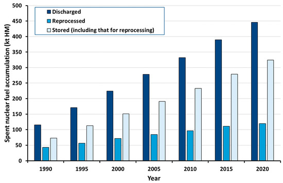 Firstly, we should consider the “source term” for radioactive wastes, i.e., the SNF arisings from the use of nuclear energy. Currently, there are around 450 operating reactors around the world providing nearly 400 GW of nuclear generation capacity [29]. However, definitive estimates of global SNF accumulation over this century are harder to find. International Atomic Energy Agency (IAEA) figures [30] estimate 11,500 t (tonnes of heavy metal) of SNF would be generated per year from 2010, with 445,000 t generated in total by 2020. Since 89% of nuclear electricity is from LWRs [29], the majority of this SNF will be uranium oxide fuels. Table 2 (adapted from [30,31]) shows that the current reprocessing capacity is around 2500 t/a (tonnes per annum), although this could in future rise to ca. 6000 t/a once the Rokkasho Reprocessing Plant in Japan is operational and new plants in Russia, China and India are constructed and commissioned. These data would suggest a somewhat higher rate of SNF accumulating in storage than that published by the IAEA in 2016 of 7000 t/a [32]. By 2020 around one-quarter of spent fuel arisings were estimated to be reprocessed, with the rest in interim storage (Figure 2). Another source [33] estimates that around 550,000 tonnes of SNF is expected to accumulate in 17 countries by 2050, consistent with the IAEA estimated rate. An OECD-NEA study that took a long-term and global view estimated that by 2150 the OTC could generate 4.5 megatonnes (Mt) of SNF worldwide [34]. Only Sweden and Finland are likely to have DGRs for SNF operational by the early 2030s, and their capacities are 12,000 and 5500 t, respectively [35,36]. The United States filed a licence application for the Yucca Mountain (YM) repository in 2008, but long-standing political problems have suspended the process indefinitely [37]. Further, YM has a capacity limited to 70,000 t of SNF, which is about half the projected arisings for the current US reactor fleet when decommissioned around the mid-century [38].
