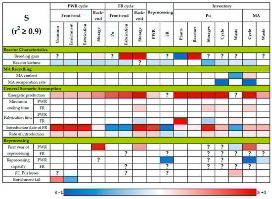 Results of a sensitivity analysis of key output parameters to input parameters used in fuel cycle models, undertaken by the OECD-NEA. Red indicates a positive sensitivity coefficient, meaning that an increase of the input parameter induces an increase of the output parameter. Blue indicates a negative sensitivity coefficient, meaning that an increase of the input parameter induces a decrease of the output parameter. When r2 is lower than 0.9, the related sensitivity indicator is replaced by a question mark “?”. Redrawn from data in [48].
