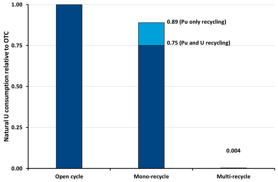 These three recycling scenarios were calculated to use 8.2%, 12.4% and 39.6% less uranium, respectively, than the OTC. Similarly, MIT calculated that plutonium recycling saves 15% and reprocessed uranium recycling saves 10% of uranium resources [54]. In their fuel cycle modelling using the CAFCA code, uranium savings of 24% were predicted by 2050 with MOX and RepU recycling, rising to 33–47% by 2100 based on a transition to FRs (conversion ratios of 0.75 to 1.23) at a growth rate for nuclear energy of 2.5%. An interesting observation is that starting up FRs based on enriched uranium also saves uranium resources (by around 50% at 2100) because of the earlier phasing out of LWRs compared with the OTC, as well as scenarios based on the recycling of transuranics (TRUs) from LWRs to start up the fast reactors. Figure 4 from the OECD-NEA illustrates the savings in uranium resources quite clearly, where it is seen that the TTC (mono-recycling) uses only 75–89% of the uranium needed for the OTC and multi-recycling uses around 0.4% of the uranium used in the OTC [55].