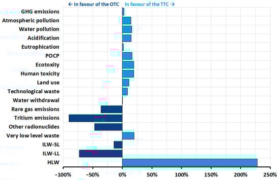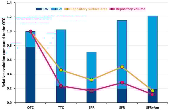 The main natural resource affecting the sustainable and economic production of nuclear energy is of course the supply of uranium ore for enrichment and conversion into nuclear fuel. Current nuclear reactors utilise 0.6–0.7% of the uranium fuel for energy production. In the OTC the remaining uranium (and plutonium) is retained in the SNF and disposed of as high-level radioactive waste. The TTC, which incorporates the reprocessing and recycling of MOX fuel, as well as potentially reprocessed uranium fuel, improves uranium utilisation by about 15–25% compared to the OTC [23]. Uranium utilisation is the amount of fresh uranium used in the fuel cycle; typically for closed cycles the savings in fresh uranium required to manufacture newly enriched uranium fuels are calculated as % uranium utilisation savings compared to the OTC. Further gains of nearly 15% are achievable if Generation III reactors, such as the EPR, replace the current fleet [49]. Whilst the resource savings can be significant over the lifetime of reactors (approximately 1500 t of natural uranium per year is saved in the French TTC for instance [5]), the overall percentage utilisation is still very low (~1%). To illustrate these points, Poinssot and coworkers have explored several scenarios based on the French nuclear energy system [22,23,49,50]; some key inputs and outputs are summarised in Table 3. Taking the example of the 408 TWe scenario, it is seen here that the TTC based on the current reactor fleet requires 7647 t/y of fresh natural uranium. However, if France converted to the OTC, then it would need 9145 t/a; hence, the use of the TTC provides savings of 16.4% in uranium resources per year. The use of a fleet based on the EPR (and a higher capacity of 453 TWe) uses 6590 t/a, and the adoption of a fast-reactor-based fleet would theoretically reduce the uranium requirements to zero. The TTC is the system currently implemented in France and so based on real data, whereas the other scenarios are designed to match the electricity generation and enable like-for-like comparisons. From this analysis, therefore, utilisation of uranium resources can be improved by: