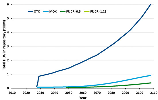 The UK is an interesting case in point, as it is transitioning from a fuel cycle based on reprocessing (the TTC) to one based on storage (the OTC), until the availability of a DGR. The UK currently has around 5500 tonnes of unreprocessed advanced gas-cooled reactor (AGR) fuel stored, pending decisions to declare it as waste and dispose of in a repository towards the end of this century [42]. There is also expected to be a further 1050 tonnes of PWR fuel from Sizewell B (assuming a 40-year plant lifetime), plus another ~900 t of fuels from experimental and other reactors [43]. Hinkley Point C will generate around another 3600 t [44] (Section 6.38.4), and any further new build will increase the inventory. The UK will also have 3200 t of HLW from reprocessing around 65,000 tonnes of SNF in Magnox and the Thermal Oxide Reprocessing Plant (THORP) reprocessing plants [43,45], as well as ~140 t of separated plutonium from reprocessing (without recycling) that is in interim storage, pending decisions to either declare it as waste for disposal in the DGR or to convert it into MOX fuel for new reactors [13].