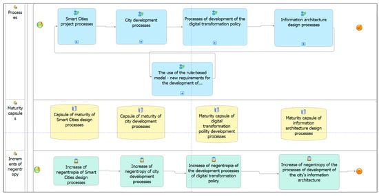 This approach was the basis for building the negentropy flow model, if the negentropy of the project, the negentropy of the city maturity processes, the policies of building digital transformation and the negentropy of the information architecture can create conditions for analyzing the flow of this negentropy and assessing the state of implementation of projects for Smart Cities. This aggregation and extension of complex digital transformation design processes and information architecture in the case of using the maturity capsule and negentropy provides a common process analysis environment for the development of Smart Cities [].
