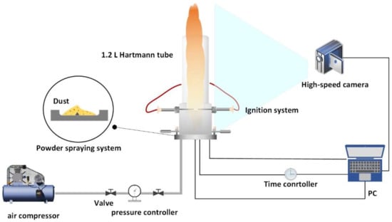 The experimental apparatus for studying the MIE of sucrose powder explosions consisted of a 1.2 L Hartmann tube (HY16428A, Hongyuan Scientific Instrument Co., LTD, Jilin, China), an air compressor, and a high-speed camera, as shown in Figure 1. The Hartmann tube is mainly composed of a quartz glass tube, an ignition electrode, and a powder spraying system. The device can provide ignition energy ranging from 0.1 to 999.9 mJ. In order to observe the flame development, a high-speed camera (MEMRECAM GX-8, nac Image Technology, Inc., Tokyo, Japan.) was used to catch flame images of the experimental process. During the experiment, a certain quantity of sucrose powder was dispersed on the umbrella diffuser at the bottom of the Hartmann apparatus; simultaneously, the air compressor, high-speed camera, and discharge ignition of the electrode was triggered, and the computer automatically recorded whether the dust was ignited. The conditions were adjusted, and the steps were repeated until all the conditions of the experiment were completed.