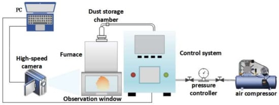 The dust MIT of sucrose powder was tested in a Godbert–Greenwald furnace (HY16429, Hongyuan Scientific Instrument Co., LTD, Jilin, China), as shown in Figure 2. The test apparatus included a heating furnace, control system, gas storage tank, solenoid valve, dust storage chamber, air compressor, high-speed camera, and observation room. The device can provide temperature ranging from 25 to 1000 °C. In order to observe the flame development, a high-speed camera (MEMRECAM GX-8, nac Image Technology, Inc., Tokyo, Japan) was used to catch flame images. The methods involved weighing a certain quantity of sucrose dust into the dust chamber and tightening the lid, setting the temperature of the heating furnace and the delay time of powder injection, and initiating the simultaneous start-up of the air compressor and the high-speed camera. The computer automatically records the dust cloud and whether it was ignited. The setting conditions were adjusted and the steps were repeated until all conditions of the experiment were completed.