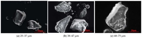 Scanning electron microscope (SEM) imaging of sucrose powder was undertaken using the Hitachi S-3400N (Hitachi (China) LTD, Beijing, China), which depicts the particle microscopic morphology. Figure 3 shows the images of sucrose dusts with different particle sizes. It shows that most sucrose particles have irregular shapes, and there are many smaller sucrose particles attached to the relatively smooth surface of larger particles.