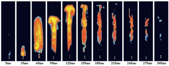 Figure 8 shows the pictures taken with a high-speed camera when the sucrose dust quantity is 0.5 g, the PIP is 50 kPa, and the furnace temperature is 340 °C. From left to right, we can see the whole process of the development of a yellow-white flame. The explosion intensity and speed of sucrose powder are very fast, and the flame is ejected from the bottom of the furnace at high speed. A shock wave will raise the unburned dust at the bottom of the observation room to participate in the combustion, and the flame will not extinguish until all the sucrose dust is completely burned.