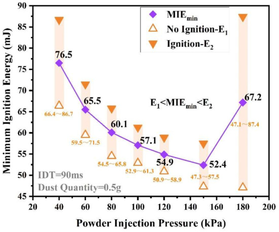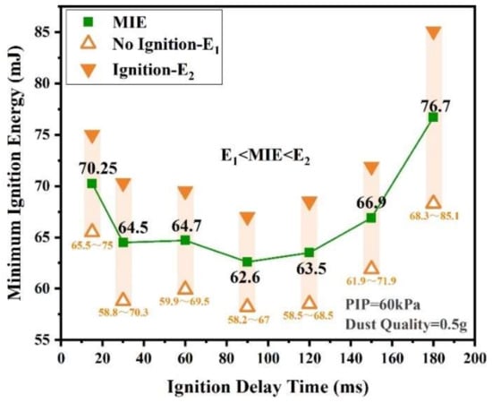 The results indicate that under the condition of constant concentration, dust particles were not fully mixed with air in a short time. A better dust cloud state failed to form in this case. So, the MIE required was bigger. In addition, a larger IDT resulted in occurring agglomeration phenomenon due to the dust self-gravity. Therefore, the explosion effect is suppressed, and the MIE increased gradually. Finally, when the IDT is 90 ms, the MIE is 62.6 mJ and approximate to the lowest point, which shows that the IDT is the greatest.