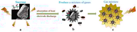 The explosive process of sucrose dust. (a) The electrodes discharge and the sugar dust absorbs heat; (b) The chemical bond breaks to create a mixture of gases (c) It explodes when it encounters a source of flame.