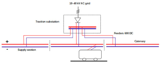 Trolleybuses are powered by an overhead dual-pole DC traction contact line. The traction line is divided into supply sections (Figure 1). Individual sections are powered by supplying wires (so-called feeders) from traction substations. The traction substations transform the AC power into DC and decreases the voltage to a suitable level. The nominal DC voltage in a trolleybus supply system, ranges from 600 to 725 V. Due to voltage drops at the feeders and at the overhead line, the idle output voltage of substations is set approximately to 110% of the rated value, i.e., 660 V or 825 V [16].