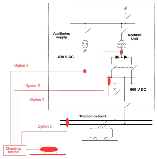 A charger supplied by the urban traction power supply systems may be connected to a power substation (as assumed in [11]) or to the DC traction overhead line. The second solution provides additional benefits, such as the large spatial availability of the overhead line. Moreover, a substantial part of traction power systems is equipped with energy storage systems, which collect energy from the regenerative braking of the vehicles. Such storage is usually connected to the DC part of the system and—when merged with electric vehicles charges—may potentially create a flexible smart grid system [8].
