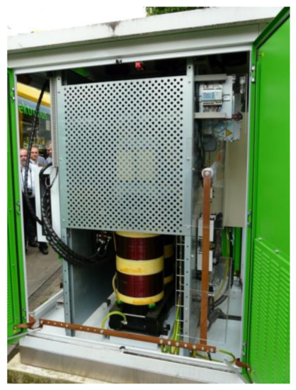 The exemplary electric vehicles charging system powered by the tram overhead line has been launched in Oberhausen, Germany (Figure 3). It consists of a DC/DC converter (Figure 4), three electric cars charging stations and one electric bus charging station.