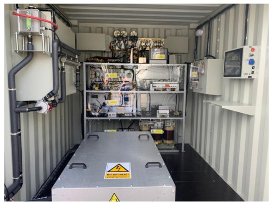 In order to increase the reliability of the power supply (e.g., in the event of excessive drops of converter input voltage) and to increase the flexibility of accumulation of trolleybuses regenerative braking energy, the station was equipped with a battery-based electric energy storage. For this purpose, a second-life traction battery from a trolleybus was used (Figure 5).