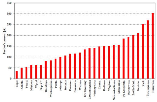 The results of the analysis of the current load on particular power sections in the trolleybus supply system of Gdynia are presented in Figure 7. The analysis is based on recordings carried out during low ambient temperature period, which translates to the highest power demand related to electric heating of the trolleybuses [20]. The maximum value of the load is approximately 300 A, which provides a large margin when compared to the limit of 840 A. Hence, it is concluded that the additional load would not result in exceeding the maximal load current value.