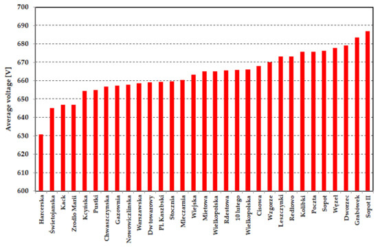 With the exception of the “Harcerska” section, which is presently undergoing modernization, the voltage values are in the range between 645 V and 685 V. The output voltages of the substations are set at the level of 680–690 V. Hence, the average drop does not exceed 50 V, which provides a large margin to the permitted value of 99 V.