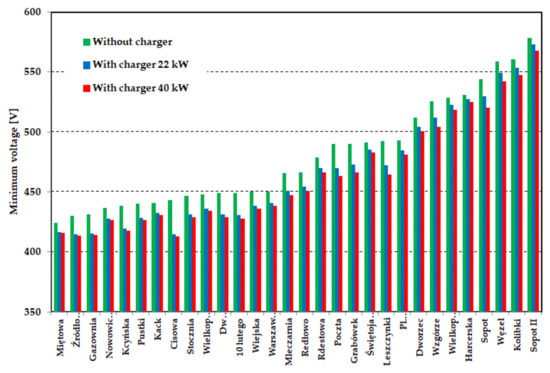 In association to criterion 2A, described in Table 2, Figure 9 shows the results of measurements of the minimum voltage level Umin in the Gdynia trolleybus network (green bars). It should be emphasized that due to the random nature of trolleybus operations, these values should be treated as indicative. In addition to the present state (green), Figure 9 includes the estimated minimum voltage Umin_char computed for assumed power of electric car charging stations: 22 kW (blue) and 40 kW (red). The computations were carried out for the most unfavourable case of positioning the charging stations at the end of the power supply sections. The values were obtained by decreasing the measured value of the minimal voltage drop by the additional voltage drop (1) caused by the charging stations.