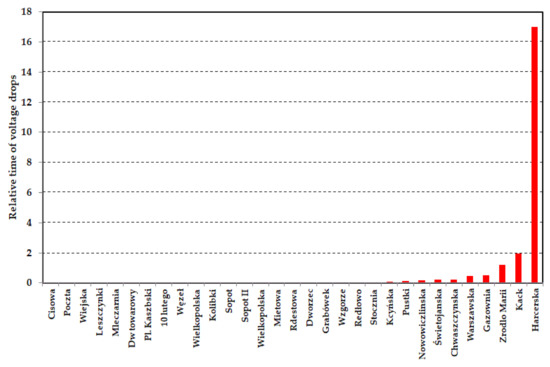 Importantly, the voltage close to the given minimal values appear rarely (typically once a day, depending on the physical situation), which is confirmed by the analysis of the relative time of the drops (Figure 10). Most of the time, the voltage in the overhead contact line is above 600 V.