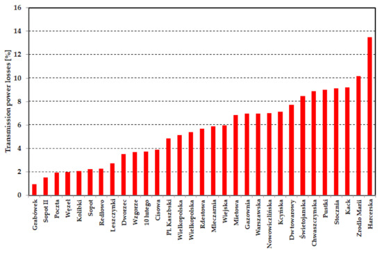 Figure 11 shows the values of transmission energy losses graphically. For most of the power supply sections, transmission losses are at the level of 5–7%, which is significantly below the recommended value, thus the charging stations can be connected there. The greatest losses occur in the “Harcerska” power section, which—as indicated before—is subject to modernization, thus the losses will be decreased there. As an important non-technical issue, the losses related to energy transmission arising in the trolleybus overhead line should be taken into account in settlements with the operator of the charging point.
