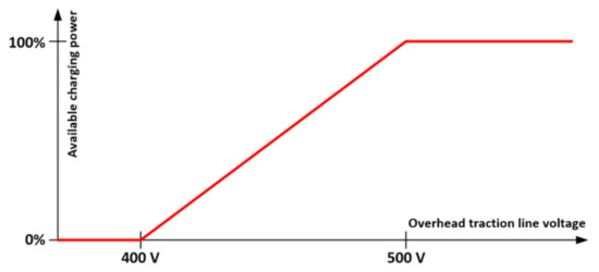 As mentioned in Section 4.2, the minimum allowable voltage in the trolleybus overhead traction line is 400 V. As the power load in urban transportation systems is variable and random, the charging stations that are connected to the overhead traction line should include control algorithms that provide protection from the undervoltage condition, similar to the ones implemented in the vehicles [23]. If the supply voltage drops below 500 V, the charging power should be limited, and this power limit should linearly change with the voltage to ensure system stability. Upon 500 V, full charging power should be available and upon voltage decrease, this power should be limited, reaching zero upon 400 V, as presented in Figure 12. The technical possibility of the dynamic limitation of charging power has been proven in [15]. The proposed undervoltage protection may cause temporary interruptions to the charging process. However, they will be rare if the power and location of the charging station will be selected with respect to the criteria discussed above.