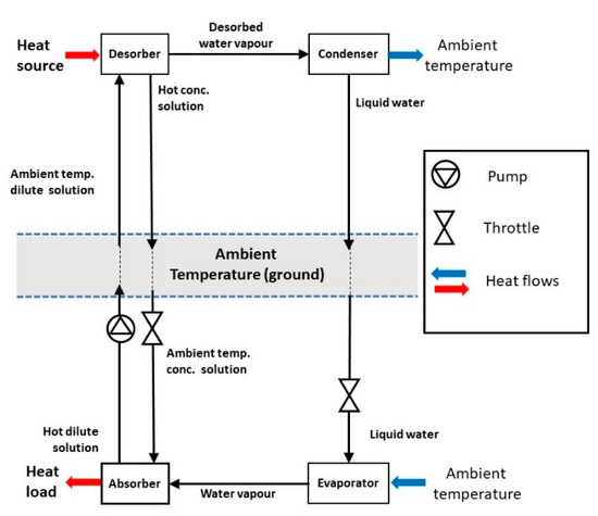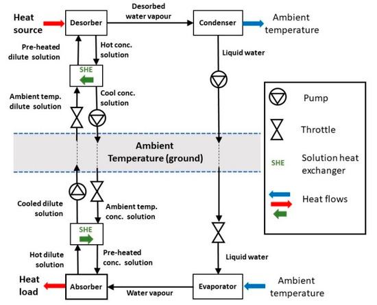 Heat for distribution, typically from a heat pump or industrial waste heat, is used to desorb water from the dilute solution. The water vapour is condensed at as low a temperature as possible to maximise the concentration change. The liquid water and concentrated solution can then be pumped to the delivery location. At the delivery point the liquid water can be evaporated by ambient temperature heat and be absorbed into the concentrated solution, releasing the heat of absorption to the load. The concentrated solution is then pumped back to the heat source side of the system. Because the heat of absorption is, in general, large compared to the sensible heat of the solutions above ambient, the basic system would be feasible, but not as efficient as it could be. Even with very high levels of pipe insulation the three liquid lines would lose significant amounts of sensible heat as they are pumped over long distances. This loss can be reduced by at least 80% by the use of solution heat exchangers (SHEs), as shown in