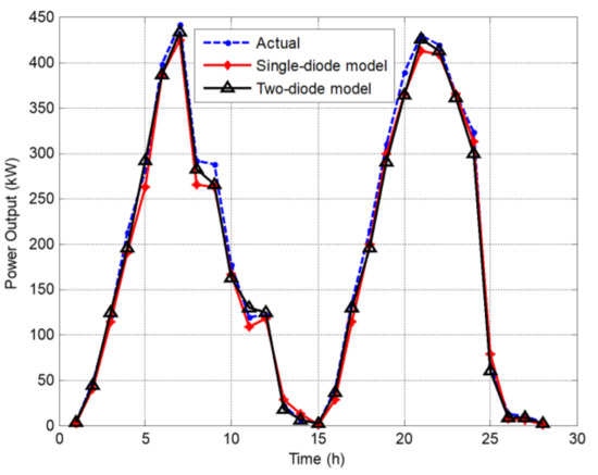 - A PV power generation system based on a two-diode model is established in the MATLAB/SIMULINK environment, which can be used for parameter estimation of PV power plants of different types and scales.