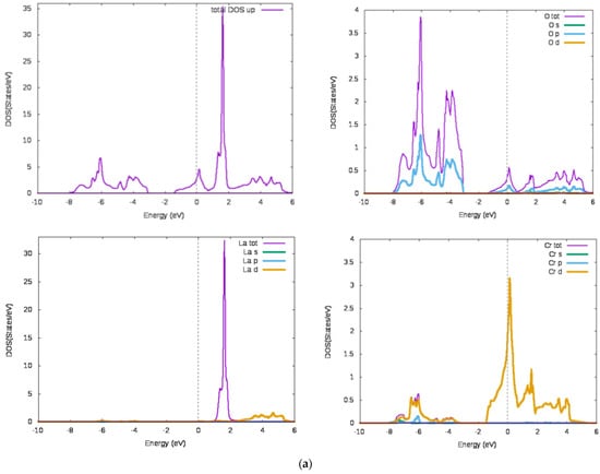 Figure 1a,b represents the total and the partial electronic densities of states (DOS) for LaCrO3 and LaCrO3H6 as a function of energy (eV). The Fermi level is set to zero energy (dotted line). The electronic band structure along the high symmetry directions obtained from the calculated equilibrium lattice constants of LaCrO3 and LaCrO3H6 is shown in Figure 1.